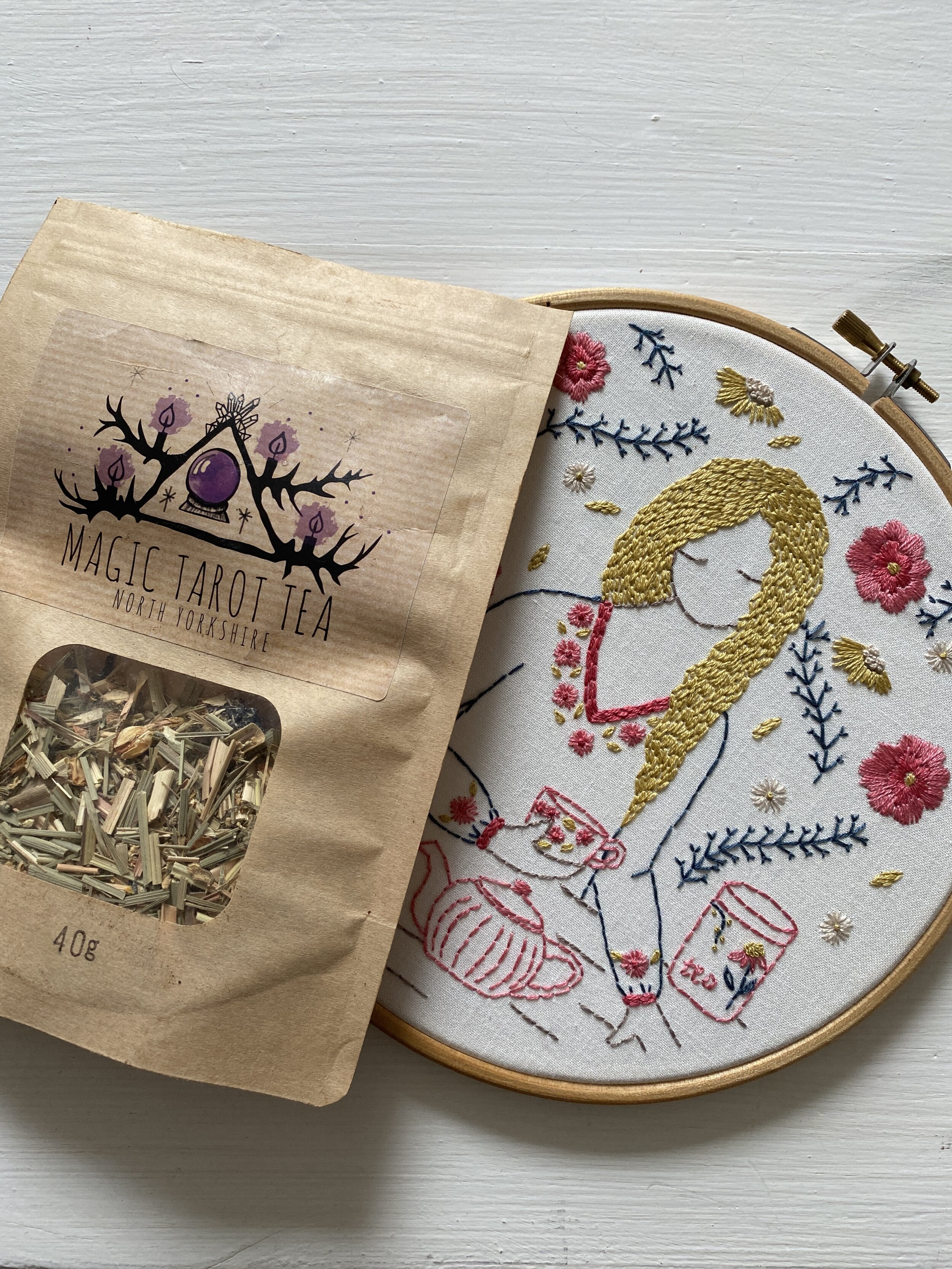 My new herbal tea design is out as an embroidery pattern and panel this week. It is inspired by an awful lot of tea drinking over the last couple of summery months. My favourite is by Tarn and moon and called ‘magic tarot tea’. I love it because it starts out blue but then you add lemon and it turns purple (although it looks quite pink in the picture). Nothing like a bit of magic to go along with your stitching. And, as an added bonus, it comes from Yorkshire, where I grew up.